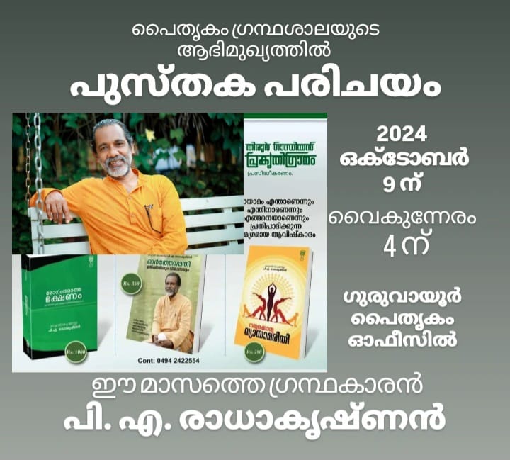 പൈതൃകം ഗ്രന്ഥശാലയുടെ ആഭിമുഖ്യത്തില്‍ നടത്തിവരുന്ന പുസ്തക പരിചയം പരിപാടി ഒക്ടോബര്‍ 9 ന് ബുധനാഴ്ച്ച വൈകീട്ട് 4ന് പൈതൃക മന്ദിരത്തില്‍ നടക്കും. തിരൂര്‍ ഗാന്ധിയന്‍ പ്രകൃതി ഗ്രാമം ഡയറക്ടറും നാച്ചുറോപ്പതി സ്റ്റും ഗ്രന്ഥകാരനുമായ ഡോ.പി.എ.രാധാകൃഷ്ണന്‍ മുഖ്യാഥിതിയായിരിക്കും. ഓര്‍ത്തോപ്പതി ഉത്പ്പത്തിയും വികാസവും, നമുക്കൊരു വ്യായാമ രീതി, രോഗം തരാത്ത ഭക്ഷണം എന്നീ പുസ്തകങ്ങളുടെ ഗ്രന്ഥകര്‍ത്താവാണ് ഡോ: പി.എ.രാധാകൃഷ്ണന്‍. കൂടാതെ പൈതൃകം ഗ്രന്ഥശാലയിലേക്ക് സ്വാമി കൃഷ്ണാനന്ദ സരസ്വതി ഗണേശപുരാണം പുസ്തകം സമര്‍പ്പിക്കുന്ന ചടങ്ങും ഉണ്ടായിരിക്കുന്നതാണ്