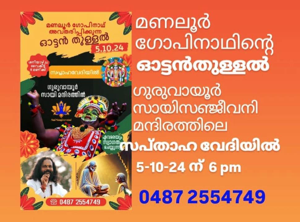 തുള്ളല് കലയുടെ ചരിത്രത്തില് വേറിട്ട വഴികളിലൂടെ സഞ്ചരിച്ച തുള്ളല് കലാകാരന് മണലൂര് ഗോപിനാഥിന്റെ ഓട്ടന് തുള്ളല് നാളെ 5-10- 24 ന് ഗുരുവായൂര് സായി സഞ്ജീവനി മന്ദിരത്തില് നടന്നുവരുന്ന ഭാഗവതസപ്താഹവേദിയില് അരങ്ങേറും. വൈകീട്ട് ആറു മണിക്കാണ് പരിപാടി. കേരള പോലീസില് സര്വീസിലിരുന്ന കാലത്തു തന്നെ ഔദ്യോഗിക ജീവിതത്തിന്റെ പരുപരുത്ത ദിനരാത്രങ്ങളിലും കലയുടെ മാര്ദവം അകക്കാമ്പില് സുക്ഷിക്കുക മാത്രമല്ല അതിനെ സമാന്തരമായി വളര്ത്തിയെടുക്കാനുള്ള ആര്ജ്ജവം കൂടികാണിച്ച കലാകാരനാണ് ശ്രീ ഗോപിനാഥ്. 2018 ല് സര്വീസില് നിന്ന് വിരമിച്ച ശേഷം മണലൂര് തുള്ളല് കളര് സ്ഥാപിച്ച് ചെണ്ട വാദ്യപഠനം, കളരിപ്പയറ്റ്, ചിത്രംവര,ശാസ്ത്രീയ സംഗീതം, എന്നിവ പഠിപ്പിക്കുന്നതിന് നേതൃത്വം നല്കിവരുന്നു.