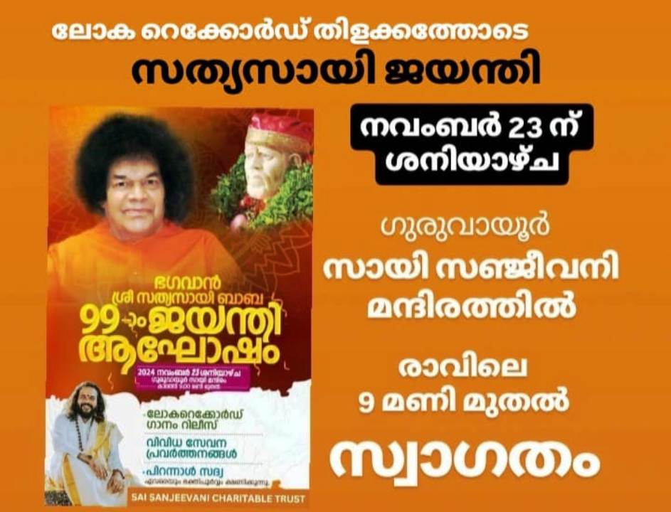 ഗുരുദക്ഷിണയായി ലോക റെക്കോർഡ് ഗാനസമർപ്പണം , ‘ *സായീരവം ” ആയി ഭഗവാൻ ശ്രീ സത്യസായി ബാബയുടെ 99-ാമത് ജയന്തി ആഘോഷം വിവിധ പരിപാടികളോടെ ഗുരുവായൂർ സായി മന്ദിരത്തിൽ സായി സഞ്ജീവനി ചാരിറ്റബിൾ ട്രസ്റ്റിൻ്റെ നേതൃത്വത്തിൽ നവമ്പർ 23 ന് ആഘോഷിക്കും. 99-ാമത് ജൻമദിനം പ്രമാണിച്ച് കവി റഫീക് അഹമ്മദ് രചിച്ച് വിജീഷ് മണി സംഗീത സംവിധാനം നിർവ്വഹിച്ച ഗാനം ഒരേ സമയം 99 ഗായകർ വിവിധ സ്റ്റുഡിയോകളിൽ പാടി സമർപ്പിച്ചതാണ് വേൾഡ് റെക്കോർഡ് യൂണിയൻ്റെ അവാർഡിന് അർഹമായത്. പ്രസ്തുത ഗാനത്തിൻ്റെ റിലീസ് ചടങ്ങിൽ നടക്കും. വേൾഡ് റെക്കോർഡ് സർട്ടിഫിക്കറ്റ് വേൾഡ് റെക്കോർഡ് യൂണിയൻ സി.ഇ. ഒ. ക്രിസ്റ്റഫർ ടെയ്ലർ സമ്മാനിക്കും. സംവിധായകൻ വിജീഷ് മണി , മൗറീഷ്യസ് ട്രേഡ് കമ്മീഷണർ അഡ്വ. ഡോ. പി. കൃഷ്ണദാസ്, ബാംഗ്ലൂർ ഇൻജക്സ് ലാബ് എം.ഡി. സി.എ. അൻസർ,തുടങ്ങിയവർ വിശിഷ്ടാതിഥികളായി പങ്കെടുക്കും. മൗനയോഗി സ്വാമി ഹരിനാരായണൻ പ്രഭാഷണം നടത്തും.കാലത്ത് 9 ന് ആരംഭിക്കുന്ന ആഘോഷ പരിപാടികളിൽ പ്രസിത ടീച്ചറും സംഘവും അവതരിപ്പിക്കുന്ന രാധാമാധവം നൃത്തശില്പം, മണലൂർ ഗോപിനാഥ് അവതരിപ്പിക്കുന്ന ഓട്ടൻ തുള്ളൻ എന്നിവയും വിവിധ സേവന പ്രവർത്തനങ്ങളുടെ ഉദ്ഘാടനം എന്നിവ ഉണ്ടായിരിക്കും. പിറന്നാൾ സദ്യയും ഉണ്ടായിരിക്കും.