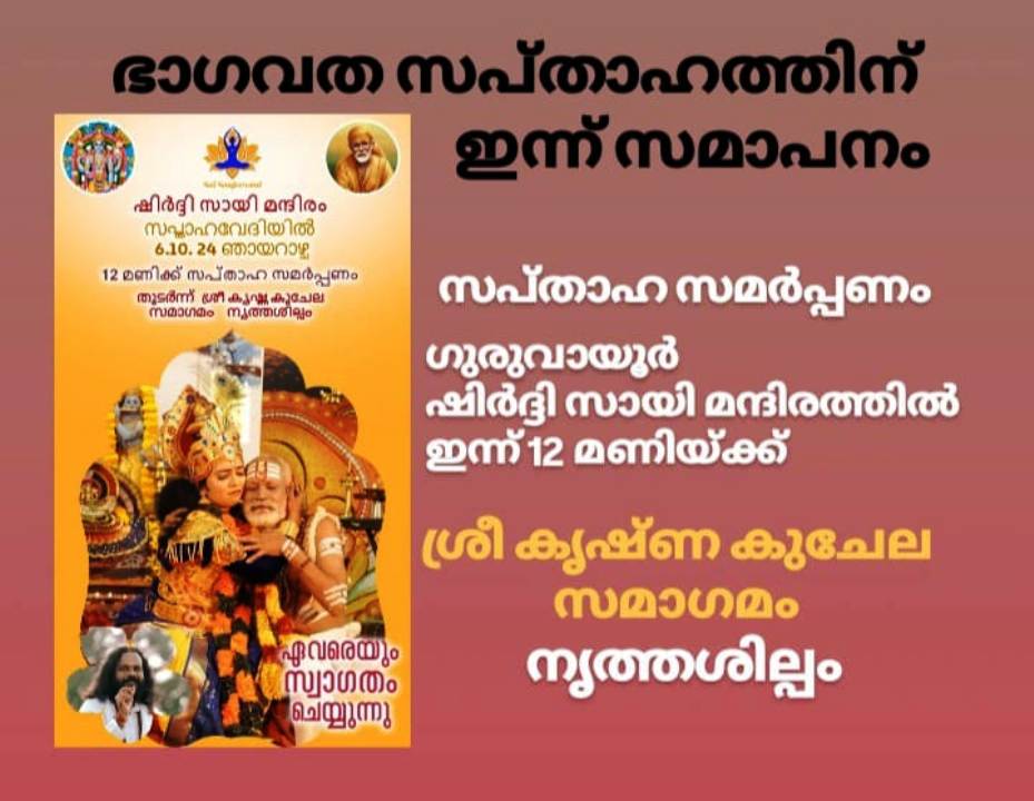 ഏഴുദിവസമായി ഗുരുവായൂര് ശ്രീഷിര്ദ്ദി സായി മന്ദിരത്തില് നടന്നുവരുന്ന ശ്രീമദ് ഭാഗവത സപ്താഹം ഇന്ന് സമാപിക്കും. സമാപനച്ചടങ്ങായ സപ്താഹസമര്പ്പണം ഇന്ന് ഉച്ചയ്ക്ക് 12 മണിക്ക് ഷിര്ദ്ദിസായി മന്ദിരത്തിലെ സപ്താഹ വേദിയില് നടക്കും. തുടര്ന്ന് ശ്രീ കൃഷ്ണകുചേല സമാഗമം എന്ന നൃത്തശില്പവും അരങ്ങേറും. കലാമണ്ഡപം സത്സംഗ സമിതയുടെ നേതൃത്വത്തിലാണ് ഗുരുവായൂര് ഷിര്ദ്ദിസായി മന്ദിരത്തില് ഈ ഭാഗവതജ്ഞാനയജ്ഞം നടന്നുവരുന്നത്.